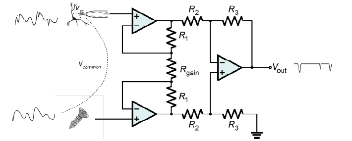 Pada lengan kita atau otak hewan, tegangan bersama ini (Vc) dapat berupa noise listrik atau aktivitas otot yang tidak kita inginkan dan ingin kita buang. Dalam hal ini, inputnya adalah: